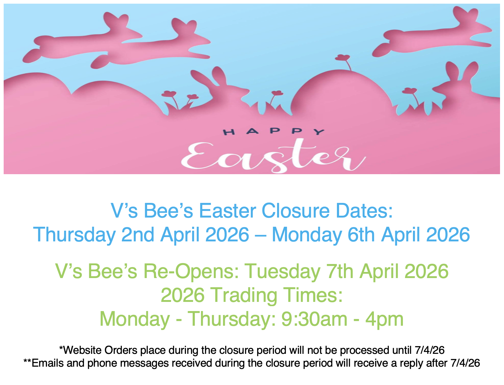All orders placed via the website will require an additional payment if you require your order to be freighted. On the completion of your order, you’ll be contact by a team member from V’s Bee’s with the freight options available for your location. If you’d like a freight quote prior to payment, please choose the “Over The Phone” payment option, with a Note “Freight Quote Required” and we’ll be in contact to discuss the freight component.