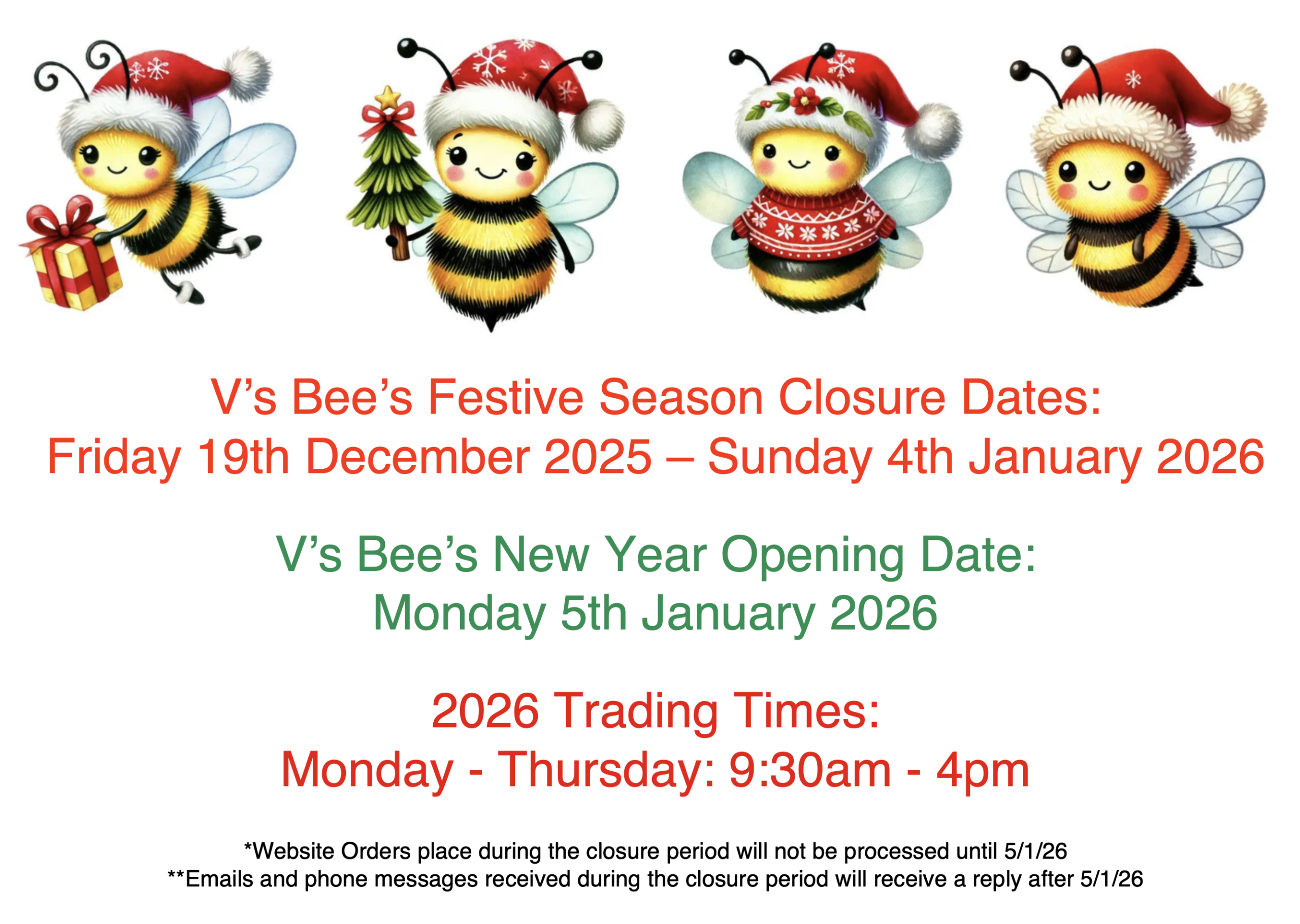 All orders placed via the website will require an additional payment if you require your order to be freighted. On the completion of your order, you’ll be contact by a team member from V’s Bee’s with the freight options available for your location. If you’d like a freight quote prior to payment, please choose the “Over The Phone” payment option, with a Note “Freight Quote Required” and we’ll be in contact to discuss the freight component.